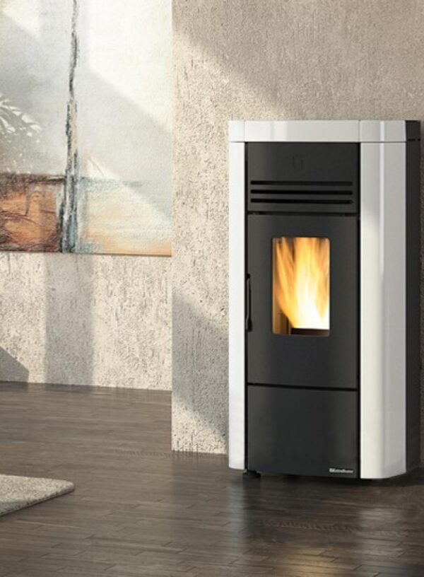 De zwarte stalen behuizing kan afgewerkt worden met keramische zijpanelen in zwart, wit en bordeaux. De kachel is uitgerust met een keramische ontsteking van de laatste generatie, een verbrandingskamer en deur in gietijzer. Een eenvoudig te bedienen multifunctionele afstandsbediening maakt het geheel compleet.