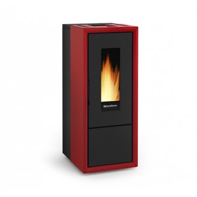 De zwarte stalen behuizing kan afgewerkt worden met keramische zijpanelen in wit en bordeaux. De kachel is uitgerust met een keramische ontsteking van de laatste generatie, een verbrandingskamer en deur in gietijzer en uitschakelbare ventilatie. De brandpot is voorzien van een automatisch reinigingsysteem. Een eenvoudig te bedienen multifunctionele afstandsbediening maakt het geheel compleet.