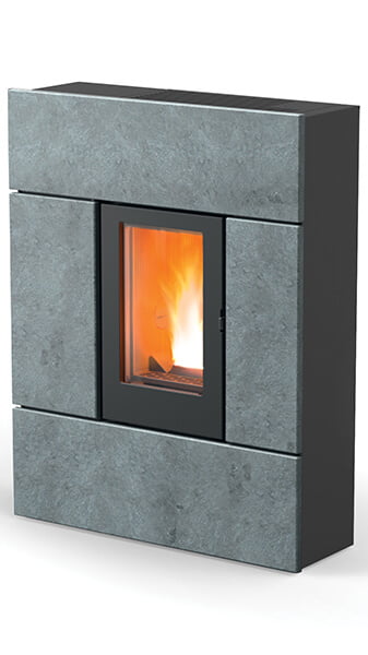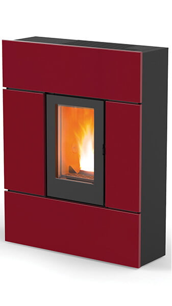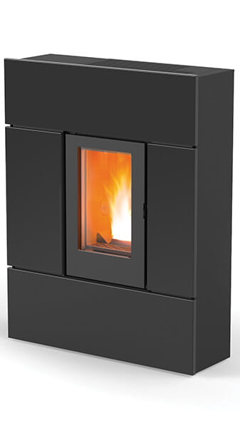 Deze zwarte stalen kachel is bekleed met een moderne front in diverse afwerkingen: