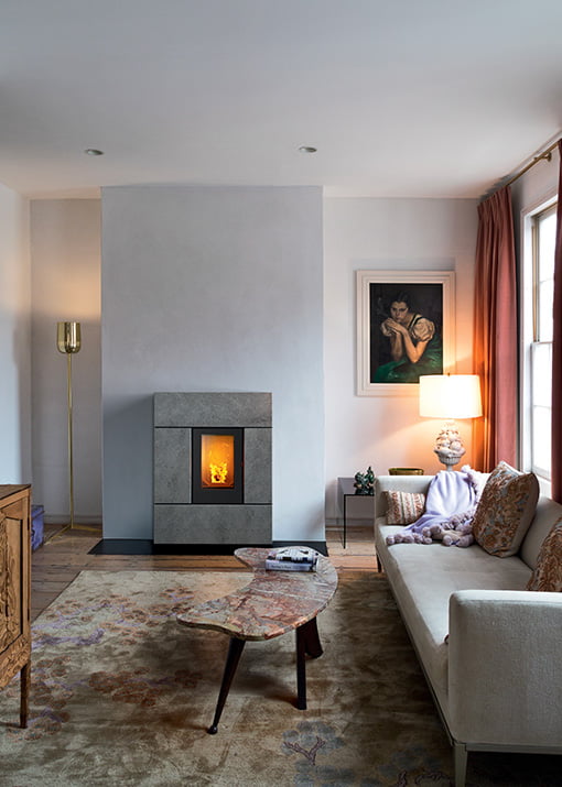 Met een diepte van slechts 29cm is Ray de ideale kachel voor smalle ruimtes en kan, naast de ruimte waarin hij staat, nog een tweede ruimte verwarmen.