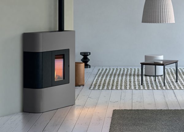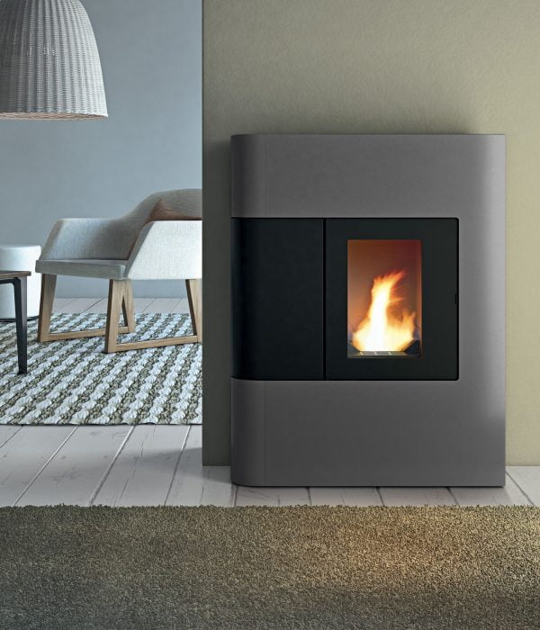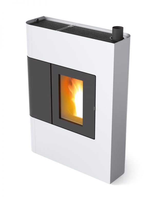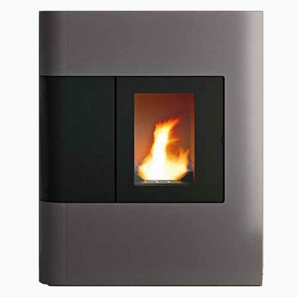 De Althea is een extreem compacte pelletkachel (slechts 28cm diep!) met een stalen bekleding in zilver of zwart.