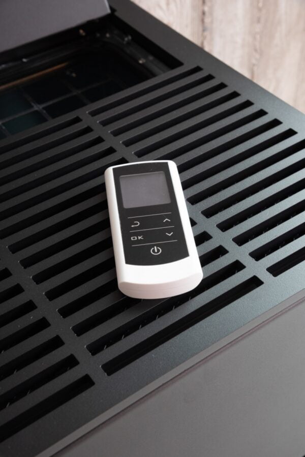 Het strakke en lineaire ontwerp van deze nieuwe serie pelletkachels wordt gesterkt door de aanwezigheid van een dubbele deur en de afwezigheid van een display op het toestel. De Qubic wordt namelijk bediend en geprogrammeerd via de standaard afstandsbediening die een bereik heeft van maar liefst 60 meter. Deze afstandsbediening werkt ook als thermostaat.